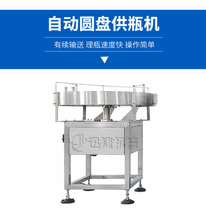 該圓盤(pán)供瓶機(jī)理瓶機(jī)是由人工將瓶子放入圓形轉(zhuǎn)盤(pán)上,轉(zhuǎn)盤(pán)轉(zhuǎn)動(dòng)將瓶子有續(xù)撥入輸送帶,進(jìn)入灌裝機(jī)進(jìn)行灌裝。使用方便,噪音小,理瓶速度快,操作簡(jiǎn)單是不可缺少的一個(gè)環(huán)節(jié)。