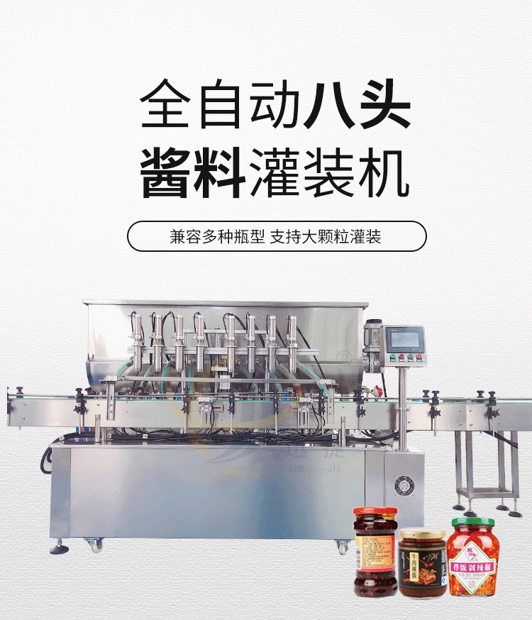全自動八頭醬料灌裝機采用活塞式灌裝原理,適用于調味品中帶顆粒并且濃度較大的辣椒醬、豆瓣醬、花生醬、香菇醬、果醬