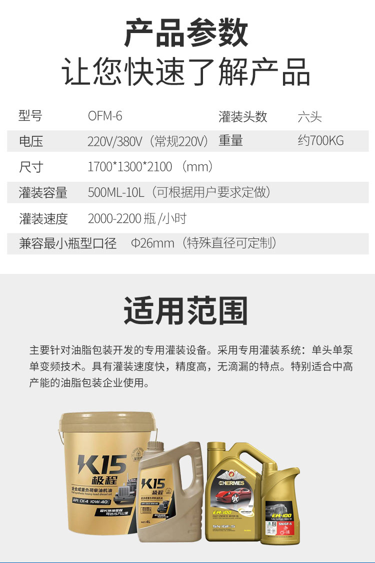 全自動六頭稱重潤滑油灌裝機主要針對油脂包裝開發的專用灌裝設備。采用專用灌裝系統:單頭單泵單變頻技術。具有灌裝速度快
