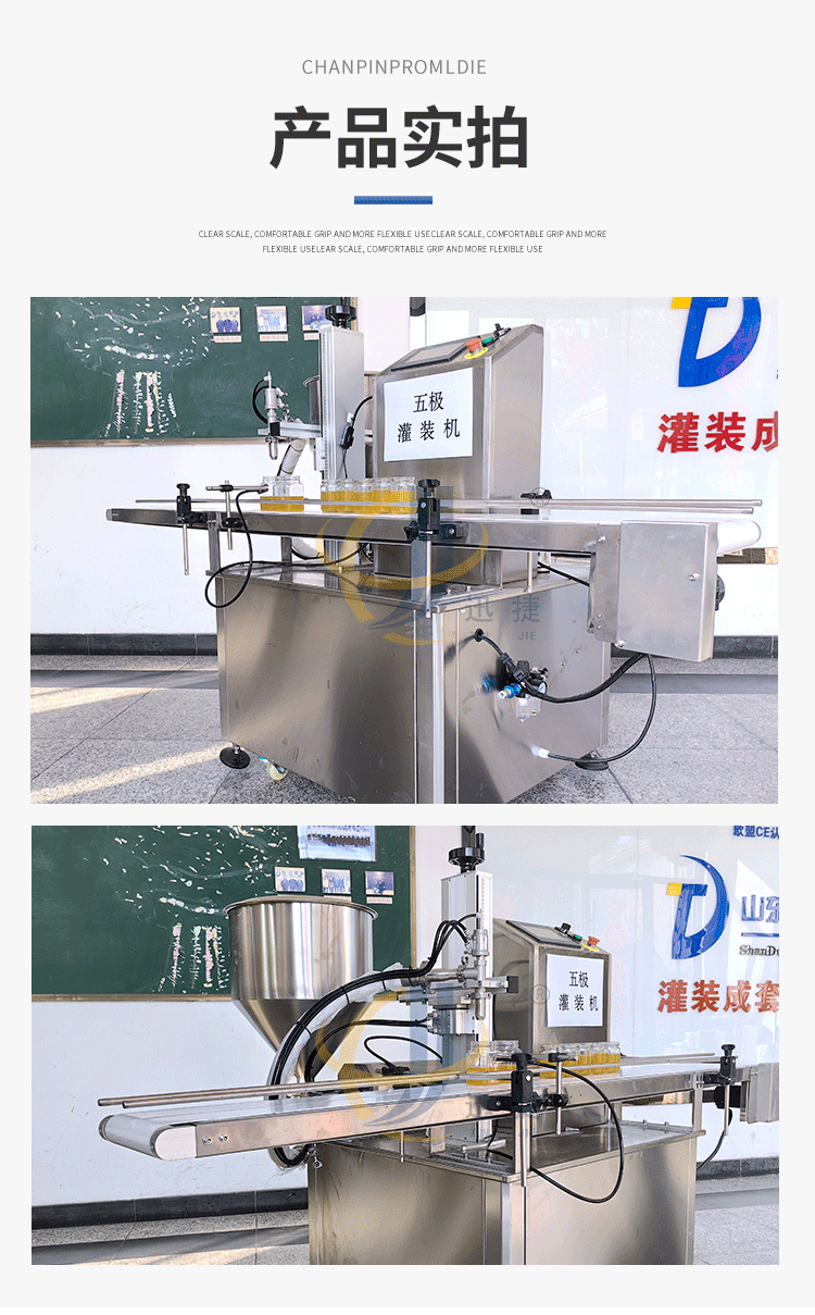五極灌裝機(jī):極快-單頭2200瓶/時(shí) 極簡-操作簡單 極廣-啥啥都能灌 極穩(wěn)-24小時(shí)不停機(jī) 極準(zhǔn)-200g誤差小于1g。它可以和真空旋蓋機(jī)搭配使用。