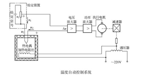 如果將控溫過程中的人工操作 (檢測和調(diào)節(jié)) 換由自動控制裝置完成,則成為包裝機自動控溫系統(tǒng)。如下圖所示,檢測元件熱電偶檢測恒溫箱內(nèi)的溫度,并將溫度轉(zhuǎn)換為對應的電壓信號2 ,同時反饋給比較器。比較器比較表示給定溫度的給定電壓信號1與檢測電壓信號2的大小,得到溫差信號,其大小和正負代表溫差的大小和方向。溫差信號△經(jīng)電壓放大和功率放大后,控制執(zhí)行電機的轉(zhuǎn)速和方向,執(zhí)行電機通過傳動裝置拖動調(diào)壓器觸頭調(diào)節(jié)供熱電壓。當溫度偏高時,動觸頭向著減小電壓( 電流)方向轉(zhuǎn)動; 反之,當溫度偏低時,動觸頭則向著增大電壓( 電流)方向運動,直至恒溫箱內(nèi)溫度達到給定溫度,溫差信號△=0 時觸頭停止運動。